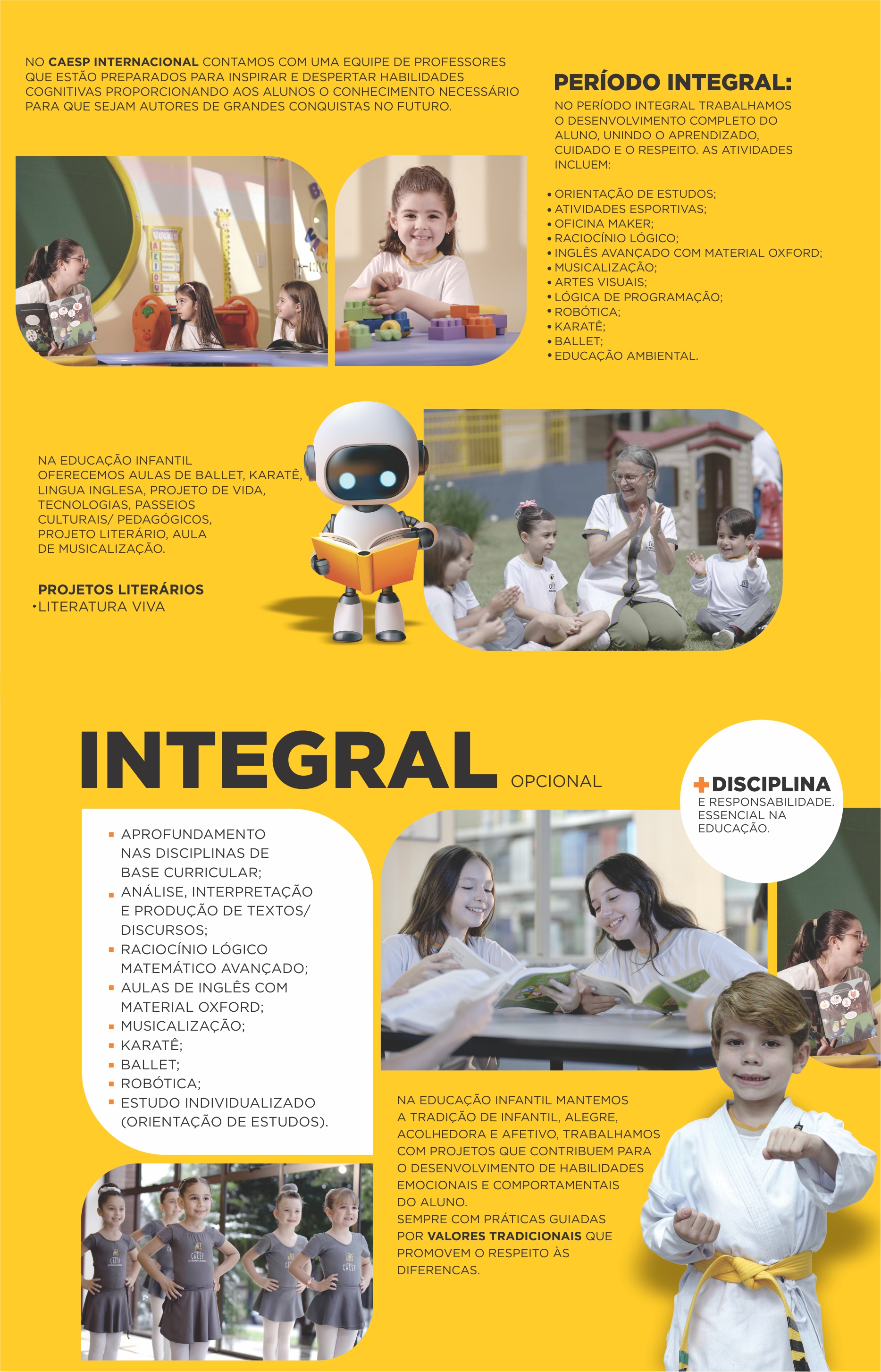 Os alunos são estimulados a experimentar e descobrir o mundo, através de atividades lúdicas envolventes e dinâmicas. Abrange as áreas de conhecimento que se organizam de forma contextualizada e interdisciplinar.