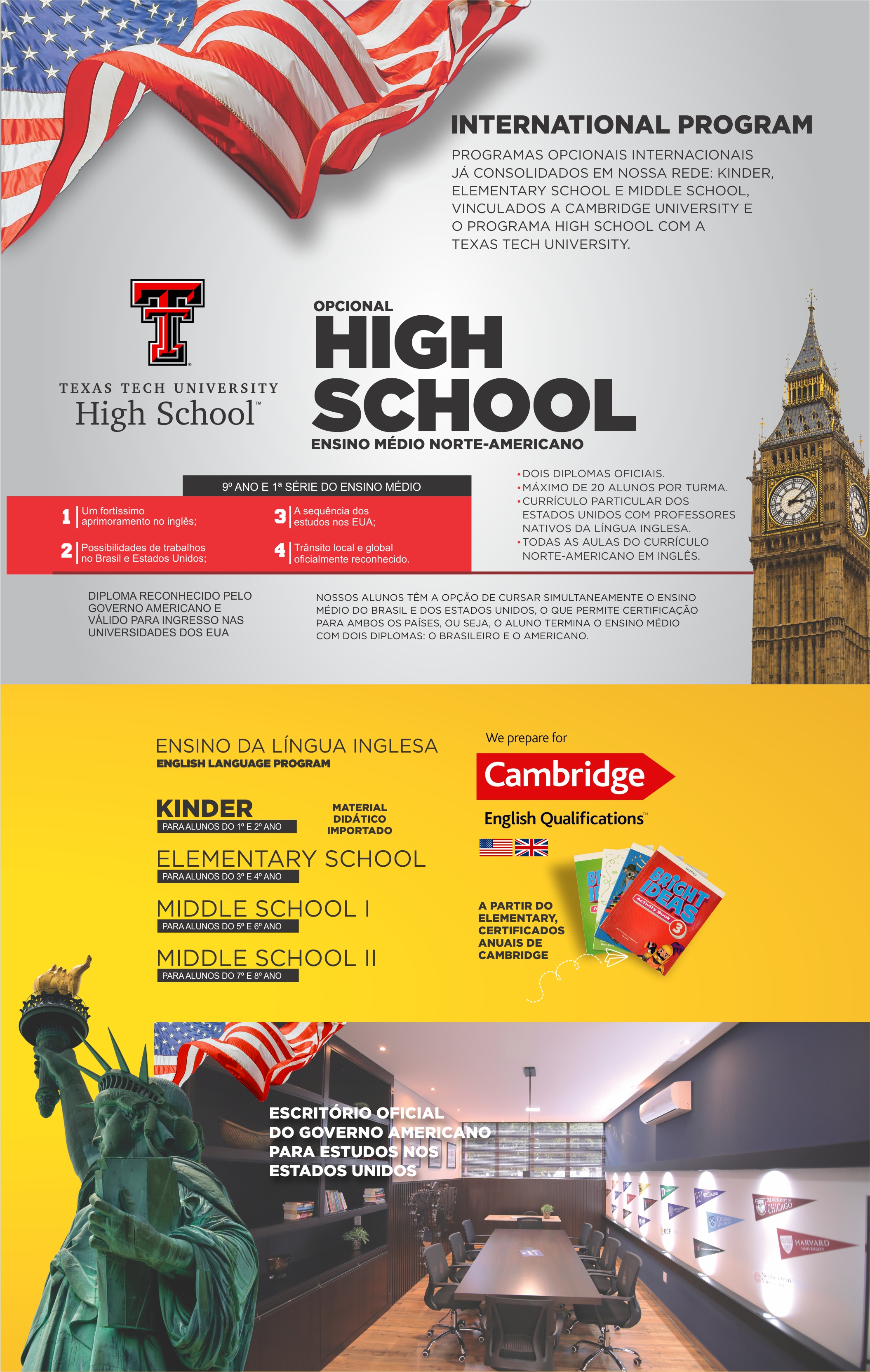 O convênio é com a Texas Tech University, uma das mais proeminentes instituições de ensino e pesquisa dos EUA. O aluno no contraturno estuda o currículo americano, em um ambiente de imersão em inglês. O aluno termina o Ensino Médio com dois diplomas: o brasileiro e o americano.
